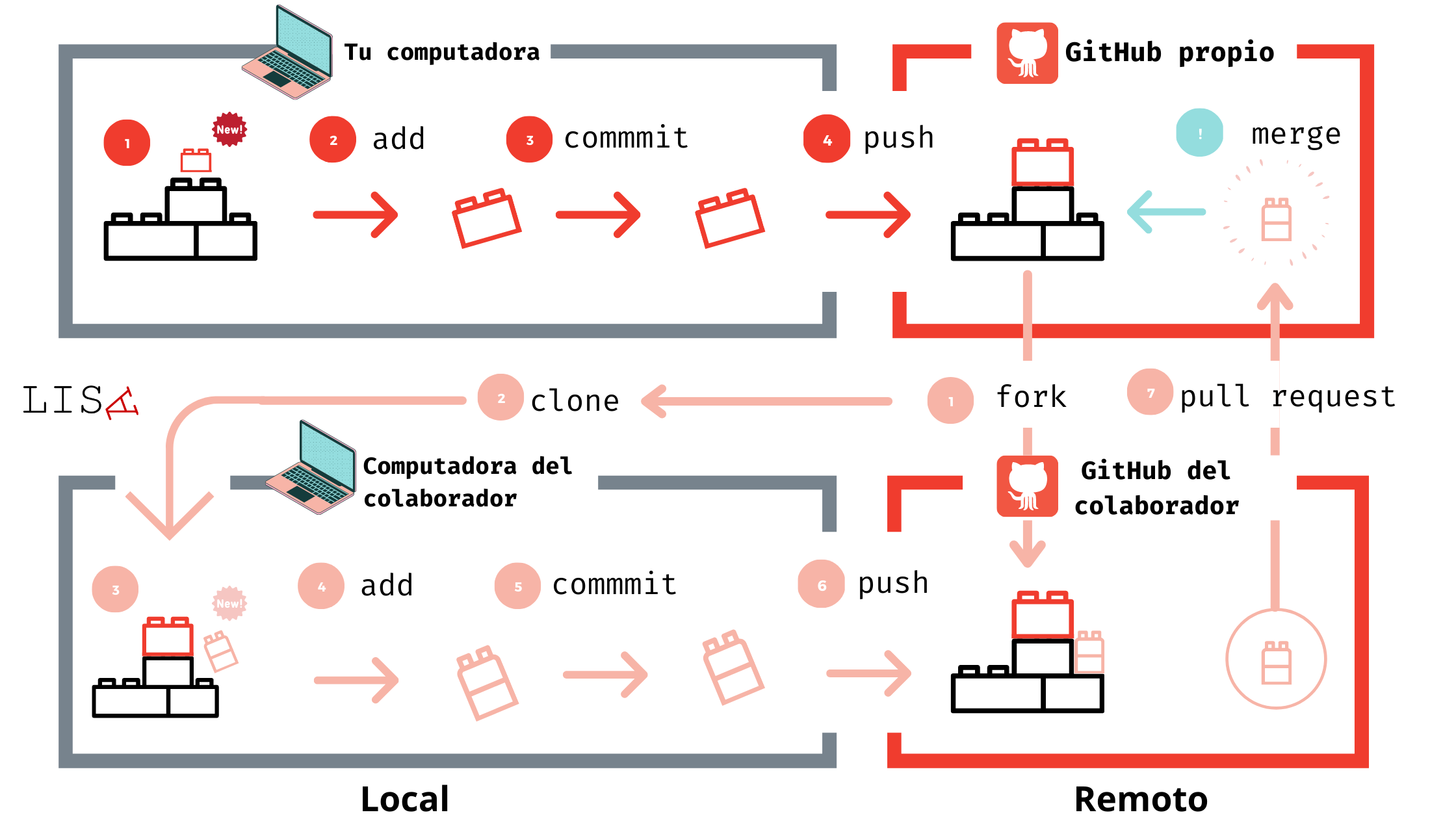 A la par existe GitHub, el cual es una plataforma de desarrollo colaborativo para hospedar proyectos que utilizan control de versiones basado en Git. Una de sus principales características es el uso de repositorios locales y remotos. La siguiente figura muestra un ejemplo:
