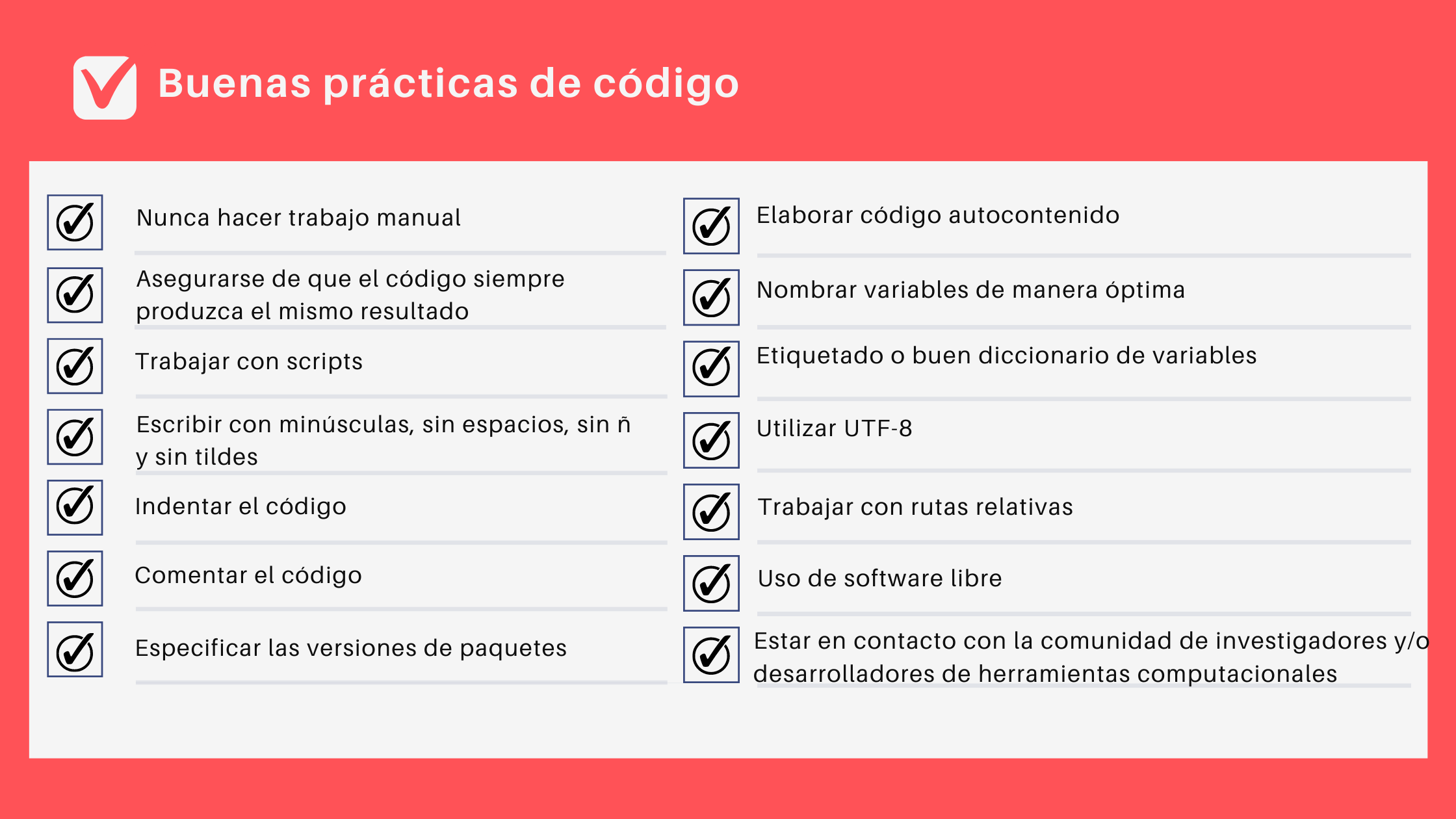 La escritura de un código de preparación o análisis requiere adoptar estándares mínimos, entre otras cosas, para facilitar la comprensión y ejecución de una rutina de código por otros usuarios que busquen regenerar nuestros resultados.