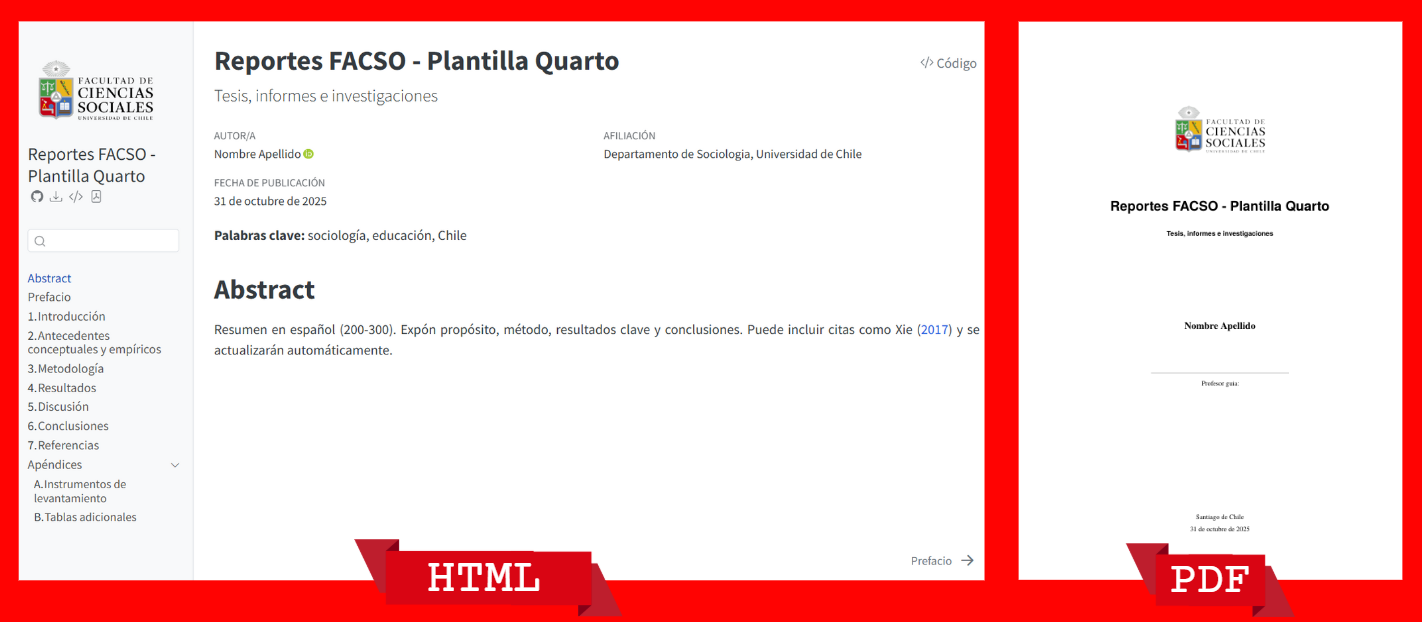 El objetivo es elevar el estándar técnico de informes académicos e institucionales en FACSO, reduciendo tiempos de maquetación y revisión. La plantilla es útil para informes de curso y seminario, tesis y proyectos de investigación, asistencia técnica y documentos docentes que requieren paridad entre HTML y PDF, citación consistente y publicación web.